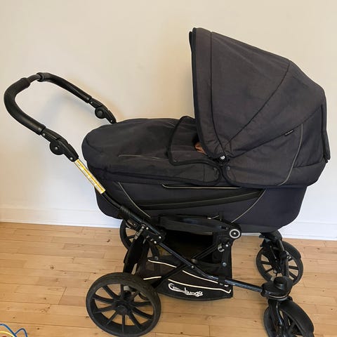 Flot og velholdt Sort kombivogn. Brugt af ét barn. Den har praktiske drejehjul foran, som kan låses så de kun kører ligeud (fx til en tur i skoven med småsten), alle dæk er punkterfrie og den har også en varekurv. Den har også rygstøtte i bunden, så barnet kan sidde op. Stellet er sort og der er ingen rust eller ridser. Det er let at slå sammen og alle fire hjul klikkes også let af. Styret kan justeres i højden og bremsen trykkes også let ned. Den har termobund til sommer og vinter og der er ligeledes udluftning i kalechen.