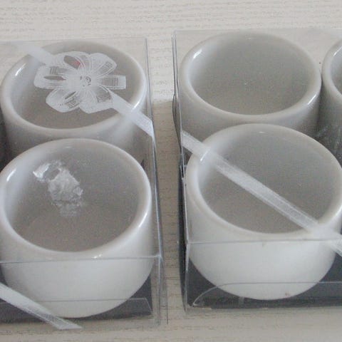 8 stk. hvide porcelæns fyrfadsstager eller æggebæger, men kan også bruges til f.eks fingresalt