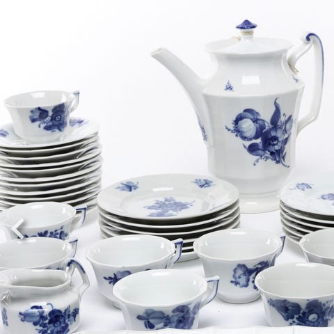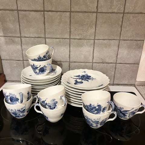 Royal Copenhagen blå blomst flettet stel bestående af kaffekopper og underkopper samt dessert tallerkner i porcelæn med blåmalet mønster. Stellet er velegnet til servering af kaffe og te.