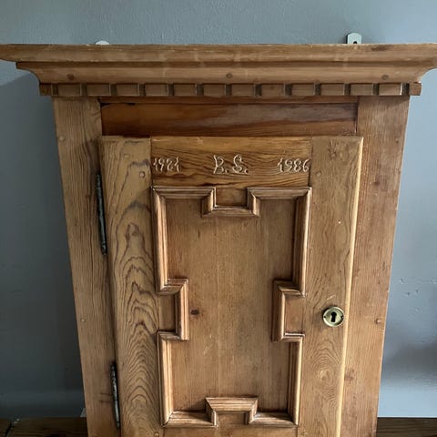 Skab i egetræ i gode materialer, som er lavet hos Smedegårds Stilmøbler. Det er lavet i barok stil og har siddet på et chatol. Det er malet grønt og er dekoreret med blomster. Der er røde hylder. Der er nøgle så skabet kan låses. Det er i rigtig gode stanad. Måler 25 x 90 x 95.