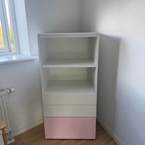 IKEA børnemøbel reol med tre hylder i farverne grøn, rød og blå. Reolen har en ramme med gule og grønne detaljer samt dekorative elementer formet som store viskelædere i toppen af stolperne. Reolen er designet til opbevaring og organisering i børneværelset.