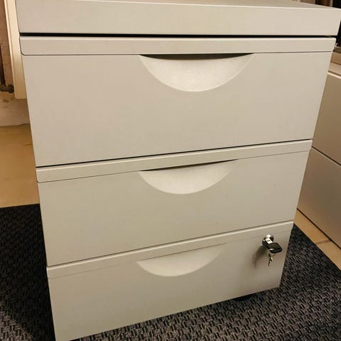 Skuffeelement med hjul (Ikea Erik skuffeboks). Kan f.eks bruges under et skrivebord. Tre skuffer. Kan låses. B: 41, D: 50, H:57. Lidt misfarvning på overfladen (se billede), ellers i god stand.