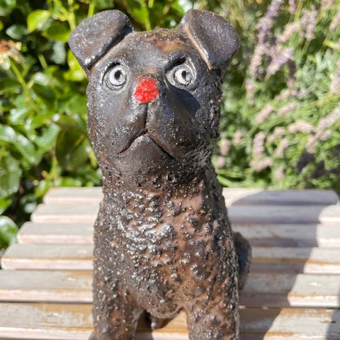 Dekorativ Chihuahua hunde skulptur. Figuren er detaljeret og velegnet til brug som boligdekoration eller samlerobjekt.