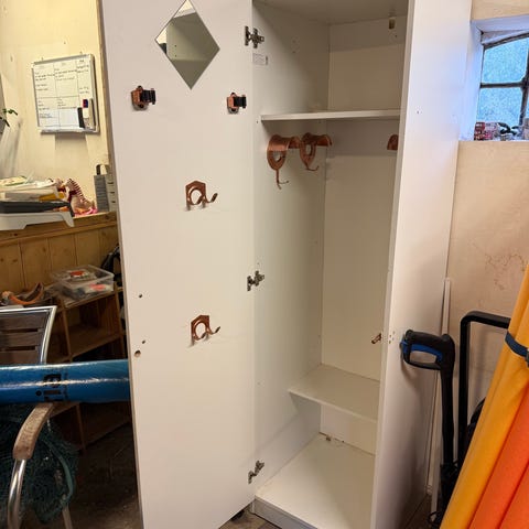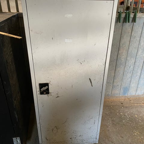 Sort metal skab med dobbeltdør. Skabet har to døre med låsemekanisme og indvendige hylder. Velegnet til opbevaring af værktøj eller andre genstande. 123 højde