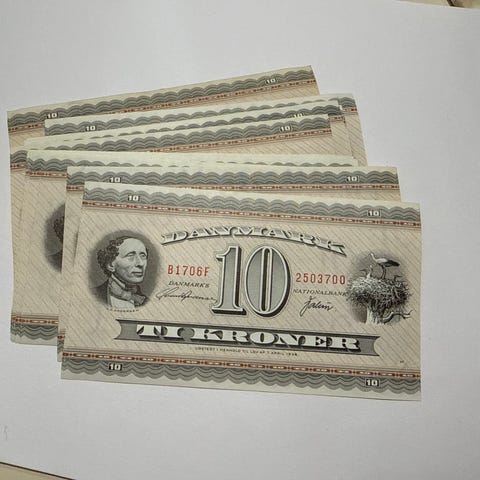 47 styk 10 Kroner sedler fra serie 1972. Sedlerne er udstedt i april 1972 og har klassisk design med portræt og dyremotiv. Materiale er papir, og sedlerne er ubrugte og i god stand. Sælges for 25 kr pr styk eller 800 kr samlet.