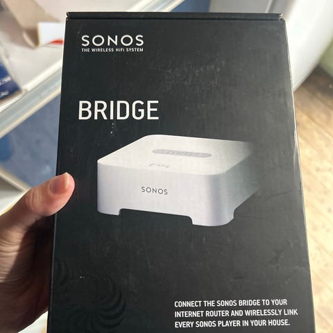 Sonos bordlampe med integreret højtaler i grå farve. Lampen har et moderne design med en stofbeklædt højtalerdel og en hvid lampeskærm. Velegnet til brug som både belysning og lydafspilning i hjemmet.