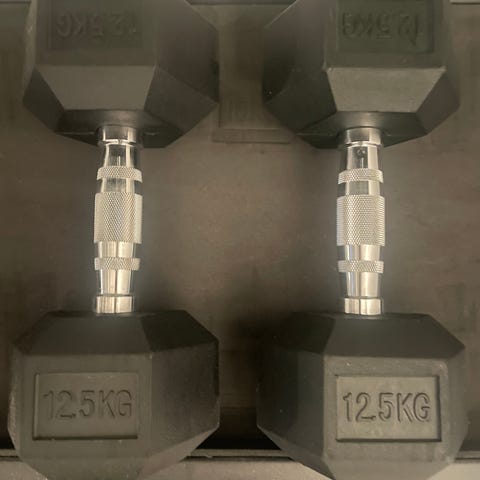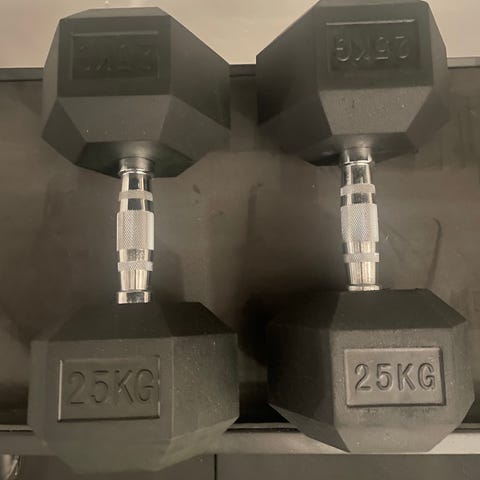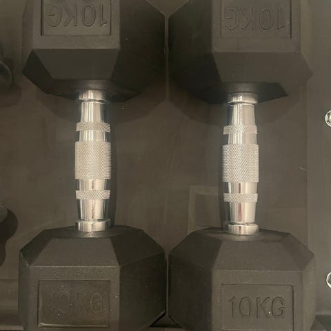 Sæt bestående af to håndvægte med en vægt på 15 kg hver. Vægtene har en sekskantet form og er belagt med gummi for bedre greb og beskyttelse af gulvet. Velegnede til styrketræning og fitnessøvelser.
