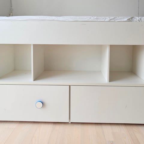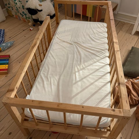 Halvhøj seng (115 cm fra top til bund) inkl børnemadras (max 50 kg) fra IKEA.