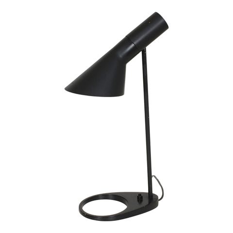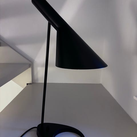 Louis Poulsen AJ bordlampe i hvid, designet af Arne Jacobsen. Lampen er lavet af vådlakeret optrukket stål med fod i trykstøbt zink. Den har en højde på 56 cm, en længde på 35 cm og en bredde på 21,5 cm og har en ledning på 2,4 meter. Den er designet tilbage i 1957 til SAS hotellet ved hovedbanen i København. Lampen er kendt for sit grafiske og rene udtryk.