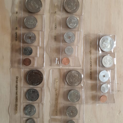 2stk 1øre og 5stk 2øre poser . 35kr . Sparebøsse fra samme bank . Skyd pengene ind via flyveren 225kr .