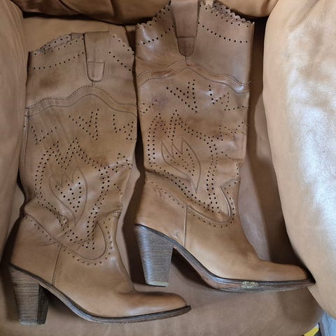 Højkvalitets ruskind cowboystøvler fra Fred de la Bretonierei str. 39. Store i størrelsen, svarer til 39,5-40. De har været brugt meget lidt, står næsten som nye. Nypris var 250eur.