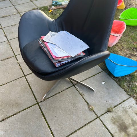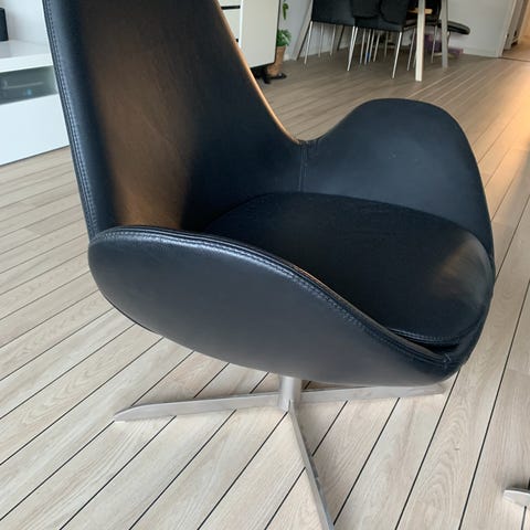 Flot lænestol i mørkegrå stof fra Flexlux “Ghost” med drejesokkel.