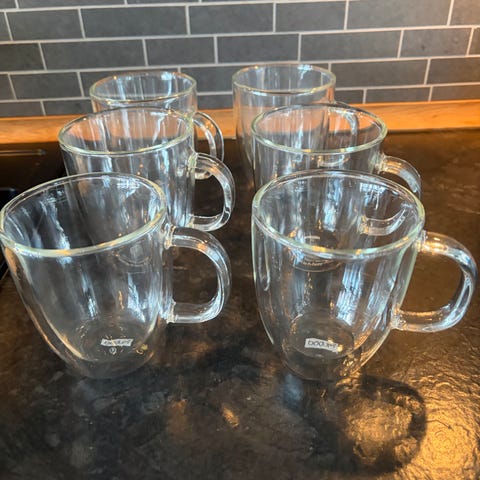 Bodum Bistro Nouveau glas kaffekrus med holder i sort. Sættet indeholder seks gennemsigtige glas kaffekrus med sorte håndtag samt en sort holder til opbevaring. Materialerne omfatter glas og metal/plastik til holderen.
