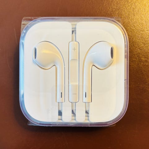 De hvide kablede høretelefoner er Apple EarPhones with Remote and Mic, som har et traditionelt, rundt design og et 3,5 mm jackstik. Dette er forgængeren til de mere almindeligt kendte, øreformede Apple EarPods.