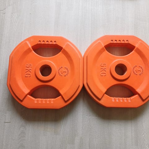 Vægtskiver sæt bestående af 5 kg, 10 kg og 20 kg. Vægtpladerne er sorte og fremstillet i gummi. De har håndtag for nem håndtering og anvendes til styrketræning.