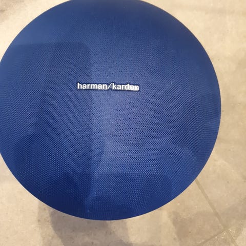 Harman Kardon Onyx Studio Bluetooth højttaler i sort farve. Højttaleren har en rund form med et bærehåndtag i sølvfarve, og den er designet til trådløs afspilning. Materialet på højttaleren er tekstil og metal.