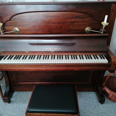 Hornung & Møller Upright klaver i træ. Klassisk design med træfinish og et traditionelt tangentbord med hvide og sorte tangenter. Det er et akustisk opretstående klaver, velegnet til musikundervisning og hjemmebrug.