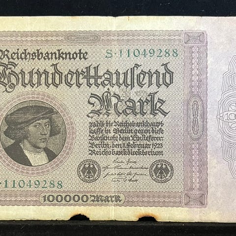 TYSKLAND DEUTSCHLAND GERMANY HUNDERTTAUSEND 100000 MARK 1923 Georg Gisze Reichsbanknote p83. STOR! 190 × 114 mm. Porto 25kr. Op til 100gram!
