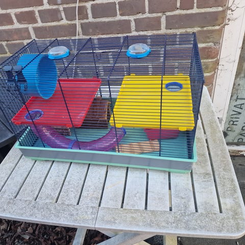 Stort hamster-Bur uden spor af brug der følger et hjul med nogle gemmesteder madskål med i det ene hjørne er der en træplade hvor man kan stille forskellige ting på kan kun hentes