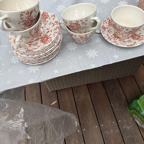 Engelske vintage kaffekopper med tilhørende underkopper i porcelæn med rød og hvid mønster. Sættet består af to kopper og to underkopper.