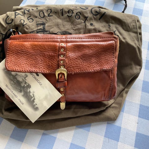 Clutch, Campomaggi, læder, Lille clutch bredde 15 cm højde 13 cm cross over.