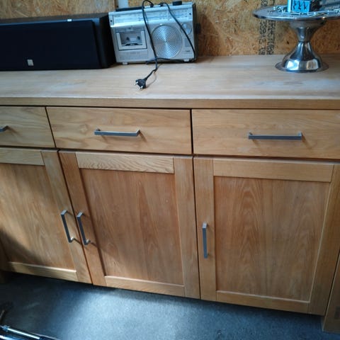 Flot skænk med god opbevaring. 2 skuffer og 2 skabslåger. Meget flot stand, dog ét brugssspor på det ene hjørne
