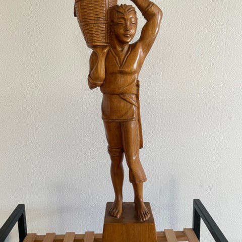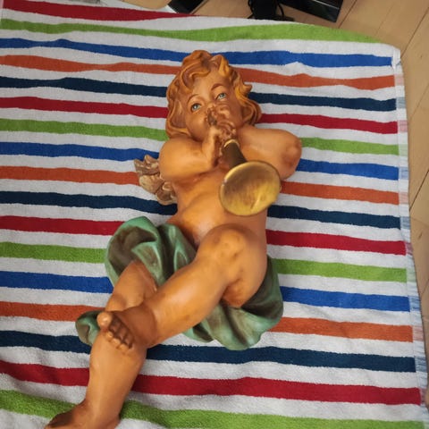 Antik knælende engel figur udført i træ med detaljeret udskæring og malet finish. Figuren forestiller en engel i knælende position, der holder en lysestage. Farverne er afdæmpede i naturlige nuancer, og figuren har et patineret udseende, der viser alder og brug. Velegnet som dekorativ genstand i hjemmet eller samling af antikviteter.