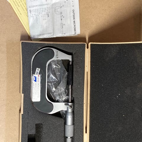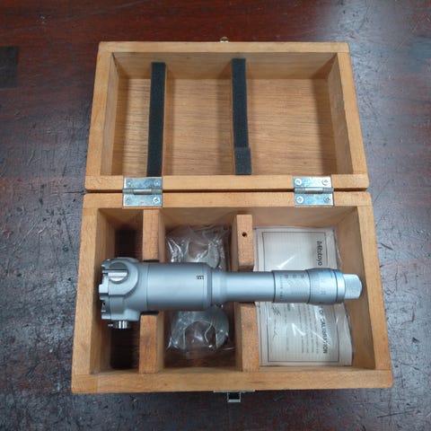 Mitutoyo elektronisk måleapparat med måleområde på 0-50 mm. Måleapparatet leveres i en trææske og er designet til præcise målinger i forskellige anvendelser.