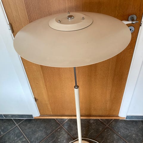 Stilren Standerlampe i mørk crom og hvid Plissé skærm. Lampen giver et behageligt lys, og er ganske dekorativ i et minimalistisk hjem. Højde 173 cm, højde på skærm 66 cm, diameter på skærm 24 cm. Fod afbryder på ledning.