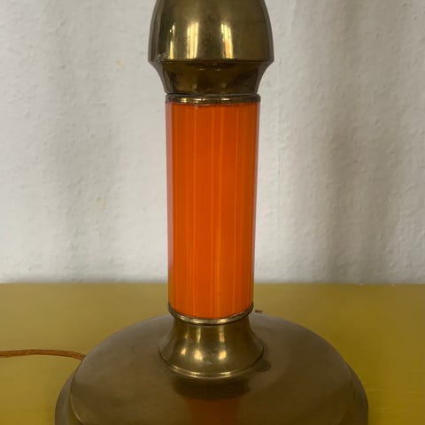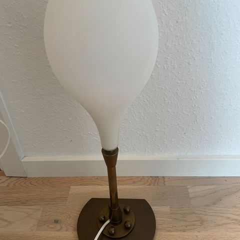 Vintage bordlampe med glaslampehoved og messingfod. Lampen har et dekorativt mønster med blomster på glasset. Højde cirka 33 cm. Passer til almindelige el-udtag.
