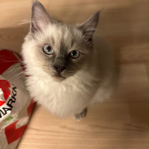 Det er med tungt hjerte, at vi søger et nyt hjem til vores dejlige Ragdoll killing.