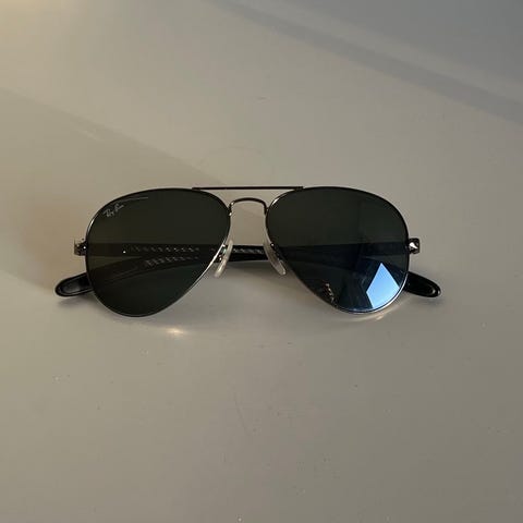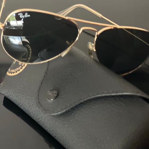 Ray-Ban Aviator solbriller til unisex med metalstel og mørke glas. Klassisk pilotstil med næsepuder og tynde stænger. Etui haves ikke længere.