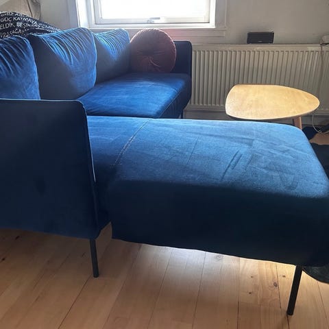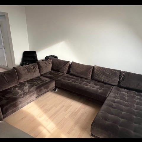 Flot hjørnesofa i sort velour. Sofaen har ikke sidde mærker eller huller i stoffet. Den har lidt sol blegning, derfor prisen .