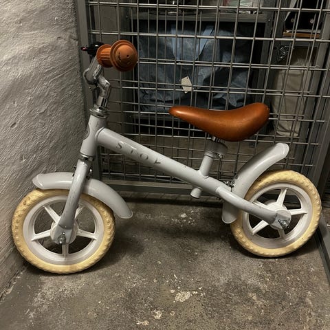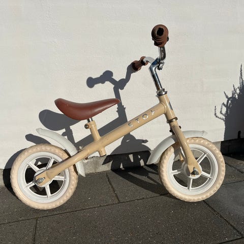 STOY løbecykel med 10" hjul i retro grøn. Cyklen har et stel i metal med brune håndtag og sadel. Designet til børn og egnet til balance- og koordinationstræning. Cyklen er stabil, let og håndterbar. En rigtig god begynder løbecykel.