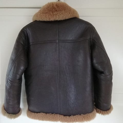 Bomberjakke i ægte læder m. fåreuld – str. XL – mørkebrun