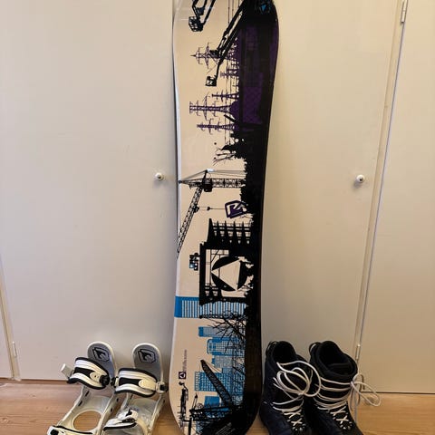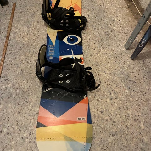Warp børnesnowboard med en længde på 135 cm. Sættet inkluderer snowboardbindinger i sort farve. Snowboardet er repareret efter en skade. Boardet er nyvokset og klar til brug.