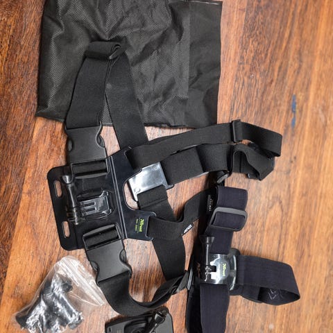 GoPro andet fotoudstyr bestående af forskellige monterings- og fastgørelsesdele til kameraer. Produkterne inkluderer en klemme med håndtag, en rund sugekop, en brystsele med justerbare stropper, en lille vinklet adapter og en hovedsele med remme. Materialerne er primært plast og stof med justerbare spænder. Udstyret er designet til at fastgøre GoPro-kameraer sikkert under forskellige forhold og aktiviteter.