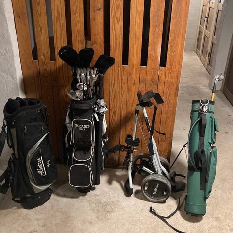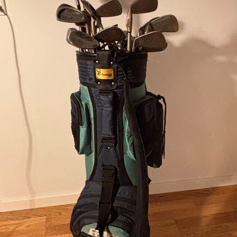 Wilson golfsæt bestående af flere golfkøller og en tilhørende golfbag. Sættet indeholder forskellige typer køller til golfspil og en golfbag med flere rum til opbevaring og transport af udstyret.