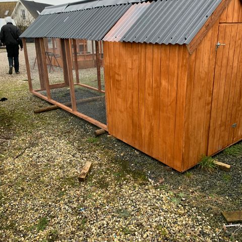 Stort hønsehus med højtmonteret rugekasse og en rigtig god højde på hele huset.