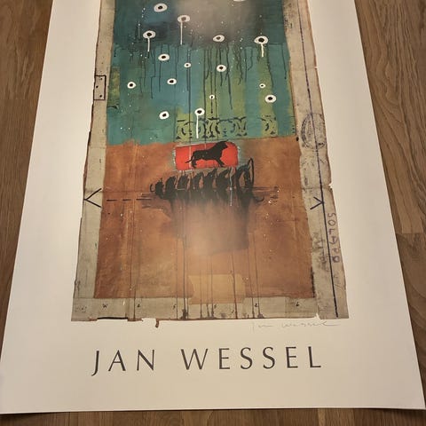 Jan Wessel kunstplakat med abstrakt motiv i blå og grå nuancer. Plakaten viser et centralt firkantet motiv med geometriske former og tekstur. Velegnet til indretning og dekorative formål.