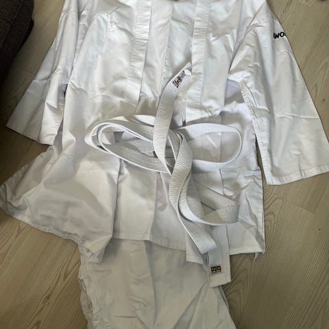 Kampsportdragt med tilhørende bælte. Dragten er hvid og velegnet til kampsportstræning. Størrelsen er 120, bukser er dog kortet lidt ned.