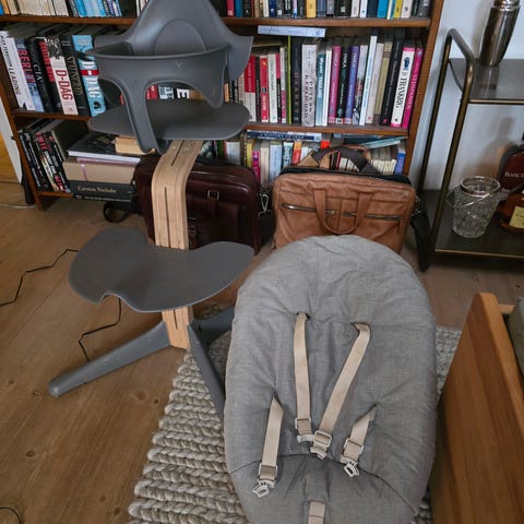 Nomi by Evomove højstol i grå farve med sæde og fodstøtte i plastmateriale samt trædetaljer. Højstolen inkluderer en grå hynde, et aftageligt bakke og babyindsats, så barnet kan ligge i stolen som spæd. Designet til at give støtte og komfort under måltider.