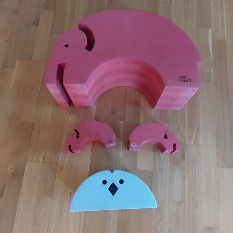Bobles orm, elefant og fisk. Slidt men der er stadig masser af leg tilbage i det. Orm og fisk sat ovenpå hinanden er brugt til at sidde på, som en bevægelig kontorstol.