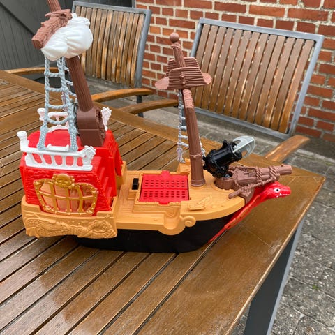 Fisher-Price piratskib / sørøverskib udstyret med røde sejl, kanoner, og inkluderer flere piratfigurer. Skibet har bevægelige dele som en åbningsmund foran og et tårn til figurplacering. Legetøjet er designet til børn og fremmer fantasifuld leg.