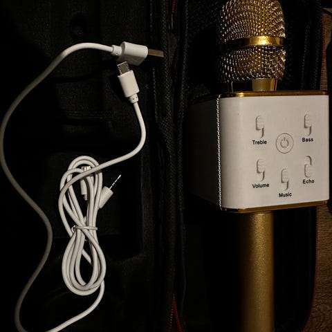 Aduro Karaoke højttaler med indbyggede LED-lys i rød, grøn og blå. Højttaleren har kontrolknapper til mikrofonvolumen, ekko, LED-lys, afspilning og pause. Leveres med to mikrofoner til karaokebrug.
