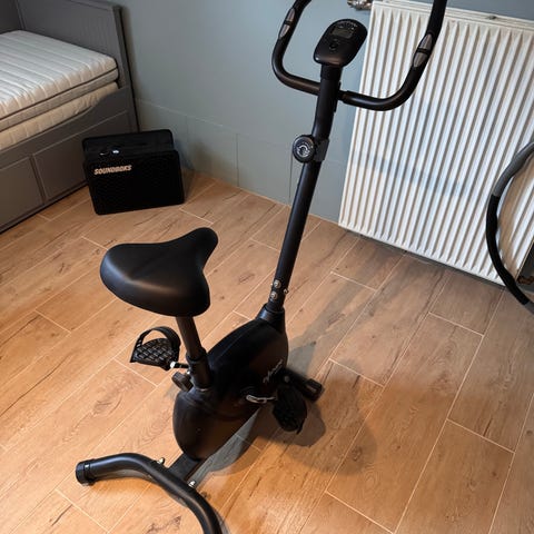 Fitness Foldbar motionscykel i sort. Cyklen har et kompakt og foldbart design, der gør den nem at opbevare.