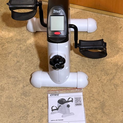 Mini Trainer motionscykel med digital skærm til måling af tid, distance, og kalorier. Kompakt og bærbar træningsenhed designet til brug til træning af ben og arme.