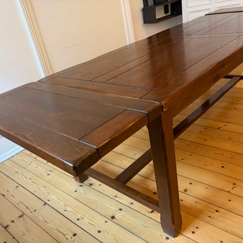 Vi sælger vores spisebord, da vi flytter og ikke har plads til det længere. Det er købt for mange år siden i Bo-tikken. Det står pænt, men med tydelige brugsspor, der kan rettes op.