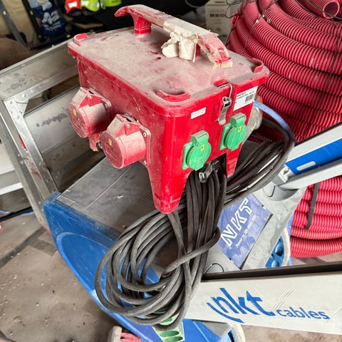 Byggström el-tavle med 4 blå og 3 røde stik