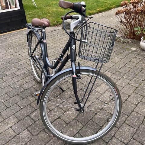 Køreklar damecykel med lys, lås og kurv.